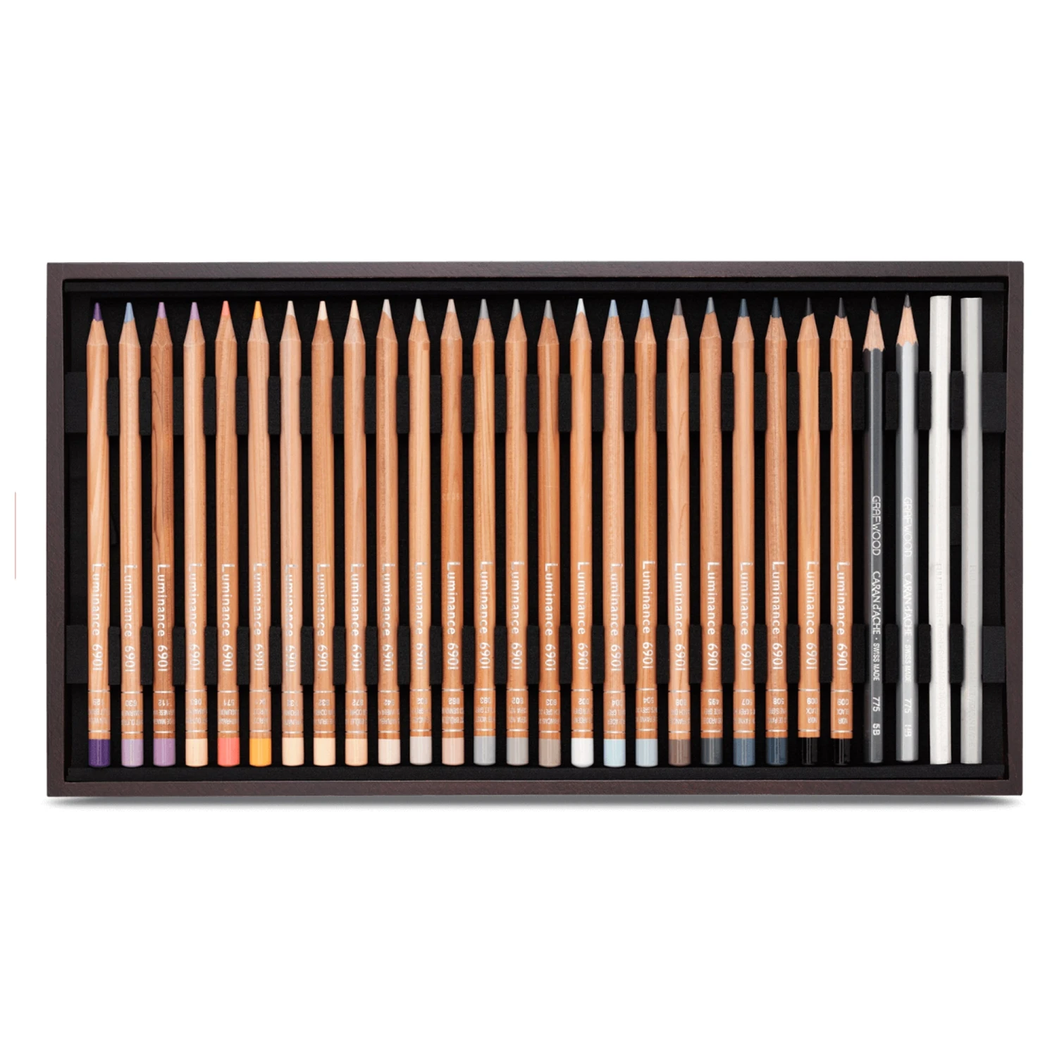 This beautiful wooden gift box set contains 76 Luminance 6901® colours + 4 repeat shades. (80 pencils) 2 Full Blender (Bright) and 2 Grafwood Graphite Pencils (HB and 5B)