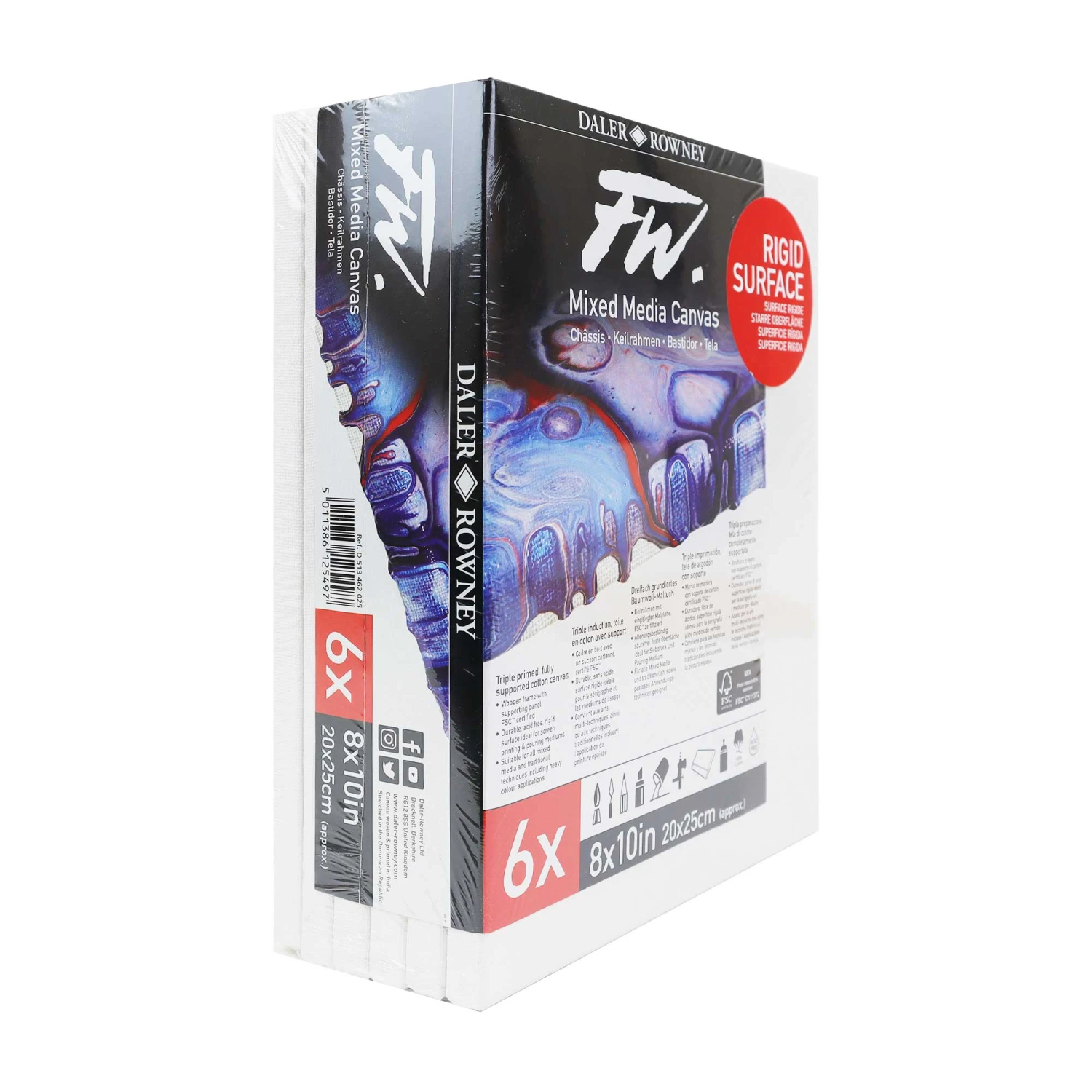 FW Mixed Media canvases feature a rigid surface, ideal for pouring and other techniques requiring a perfectly flat canvas. The traditional wooden frame construction is supplemented by the addition of a rigid board at the top face, beneath the stretched canvas fabric. Triple primed and ready for use, the fabric itself is acid free with a medium grain texture.