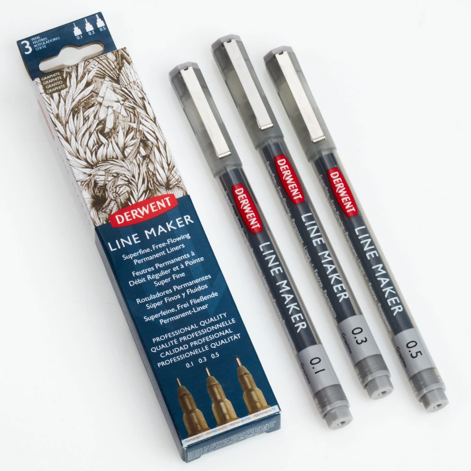 This pack includes 3 Line Makers with Graphite ink, in sizes 0.1, 0.3 and 0.5.