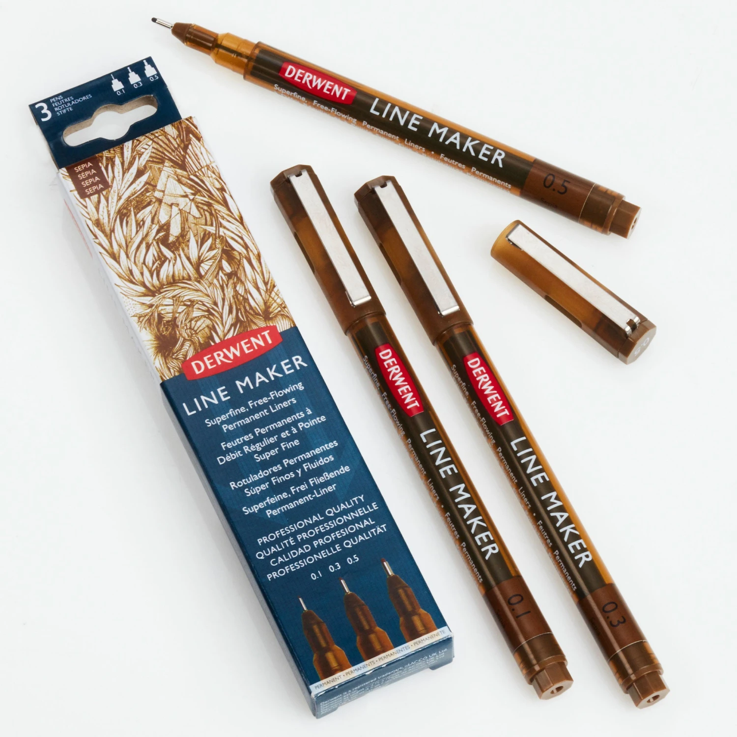This pack includes 3 Line Makers with Sepia ink, in sizes 0.1, 0.3 and 0.5.