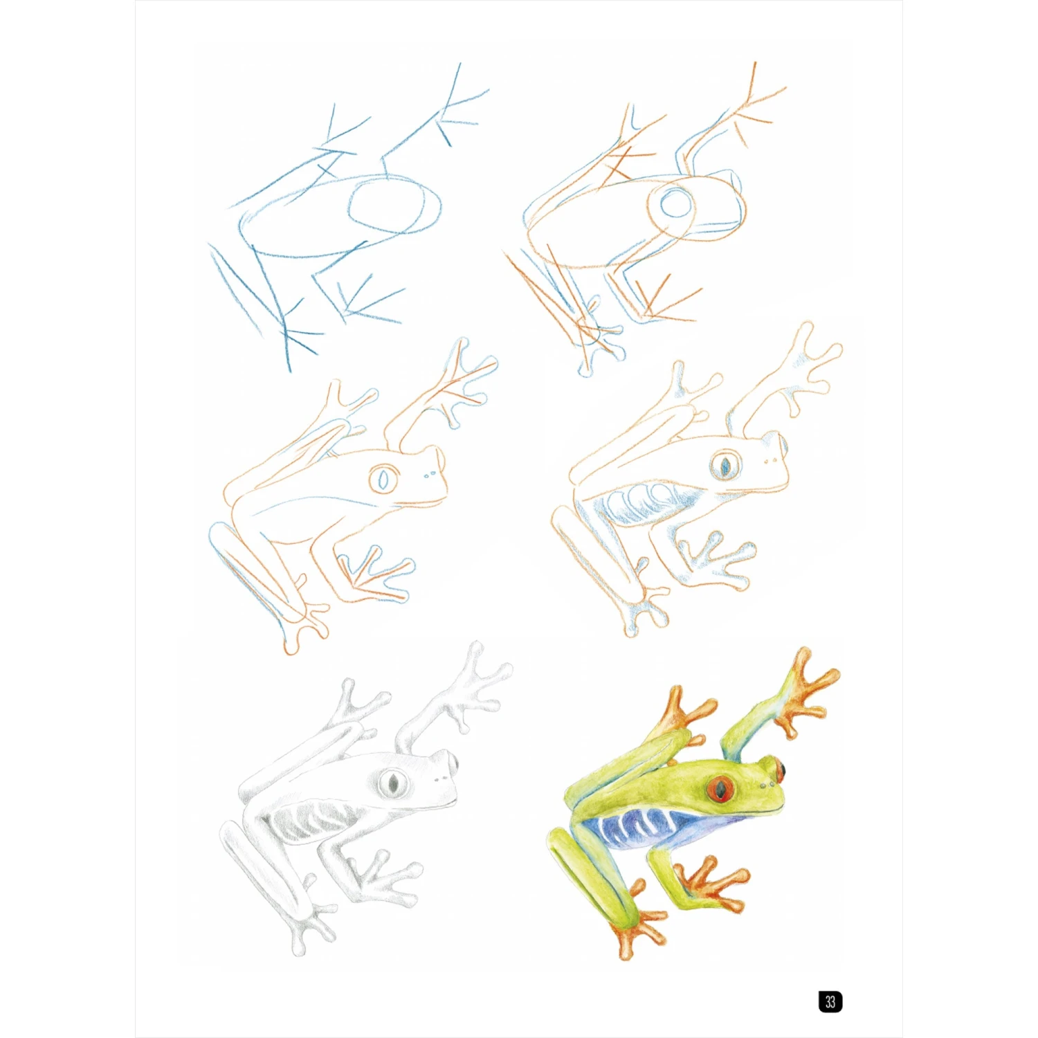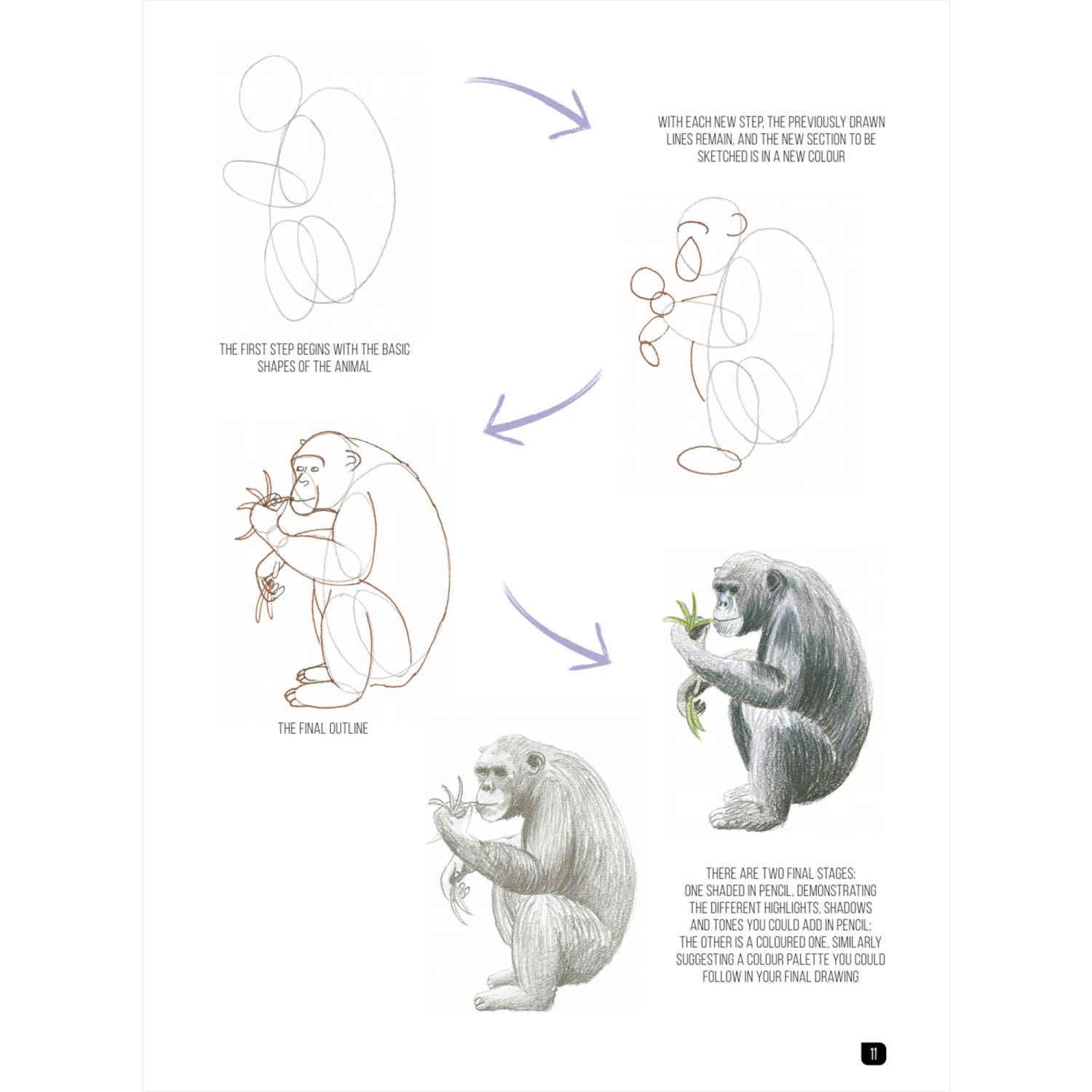 Each animal is broken down into three or four simple stages that lead you effortlessly through to the finished drawing. There are no written instructions to follow just basic shapes and pencil strokes. Even if you’ve never drawn anything before, you will be amazed at how quickly you will achieve incredibly impressive drawings. Every project also shows two finished examples of the animal one shaded with pencil and the other with colour.