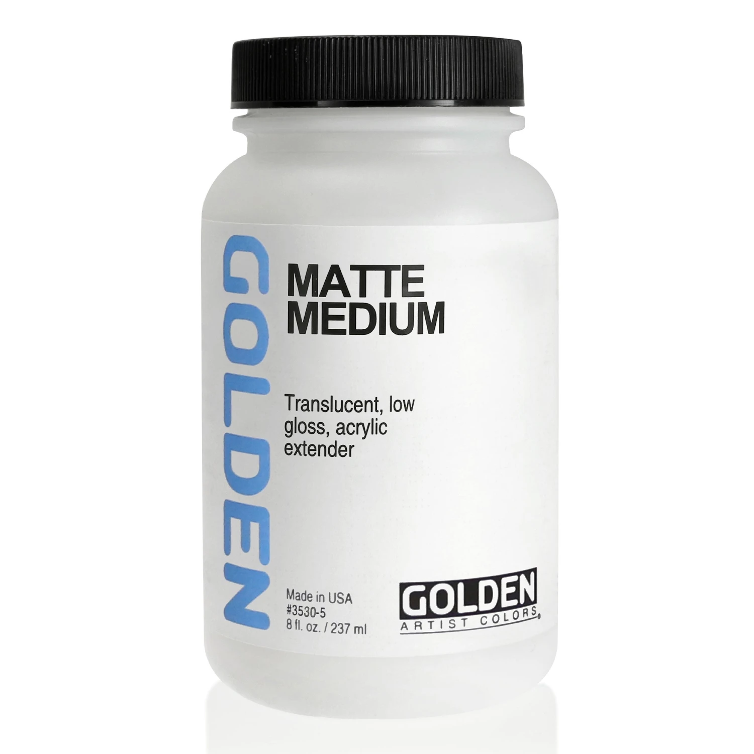 GOLDEN Matte Mediums are liquid, 100% pure acrylic polymer mediums that have matting solids added to lower sheen. They can be used to extend paints, increase translucency, and decrease gloss. GOLDEN Fluid Matte Medium can be used to lower the sheen of a high gloss product, but the blend will not result in a completely matte finish. To achieve a matte finish from a high gloss product, Super Matte Medium should be added. Fluid Matte Medium and regular Matte Medium can also be used as translucent gessoes.