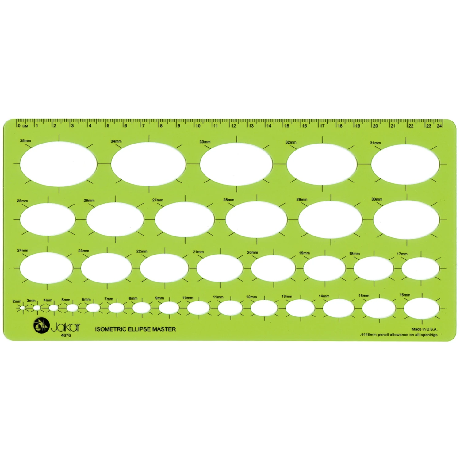 The Jakar Isometric Ellipse Master Template contains a selection of isometric ellipses from with sizes ranging from 2mm to 35mm.