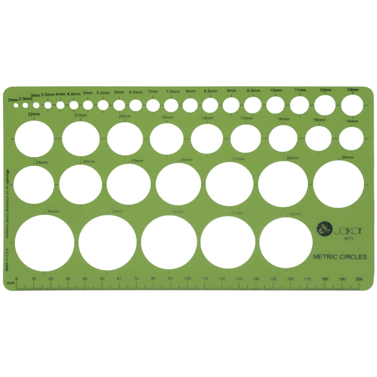 The Jakar Metric Circle Template features a selection of metric circles from 2mm up to 34mm diameter.