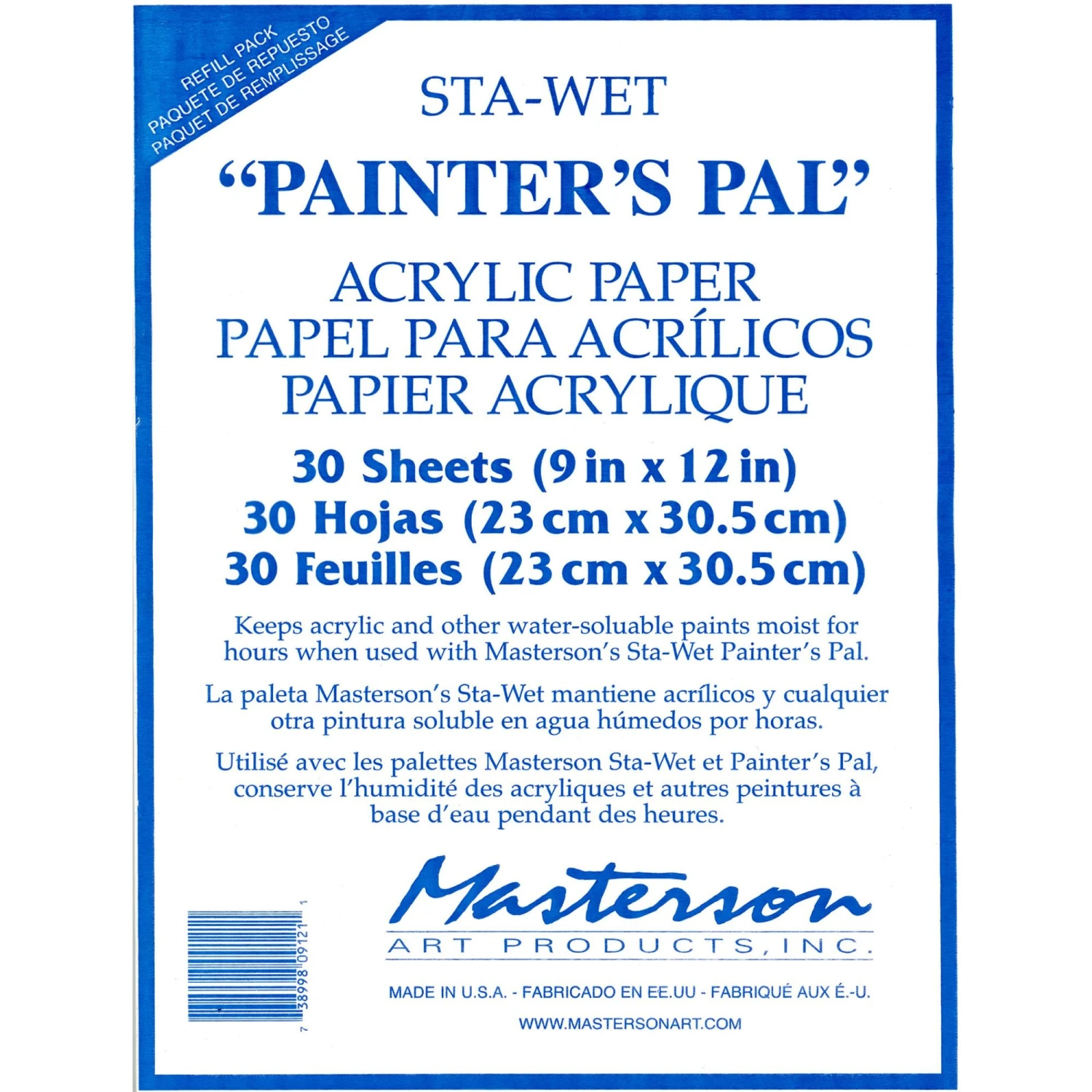 This refill pack keeps acrylic and other water-soluble paints moist for hours when used with Materson’s Sta-Wet Painter’s Pal.Â