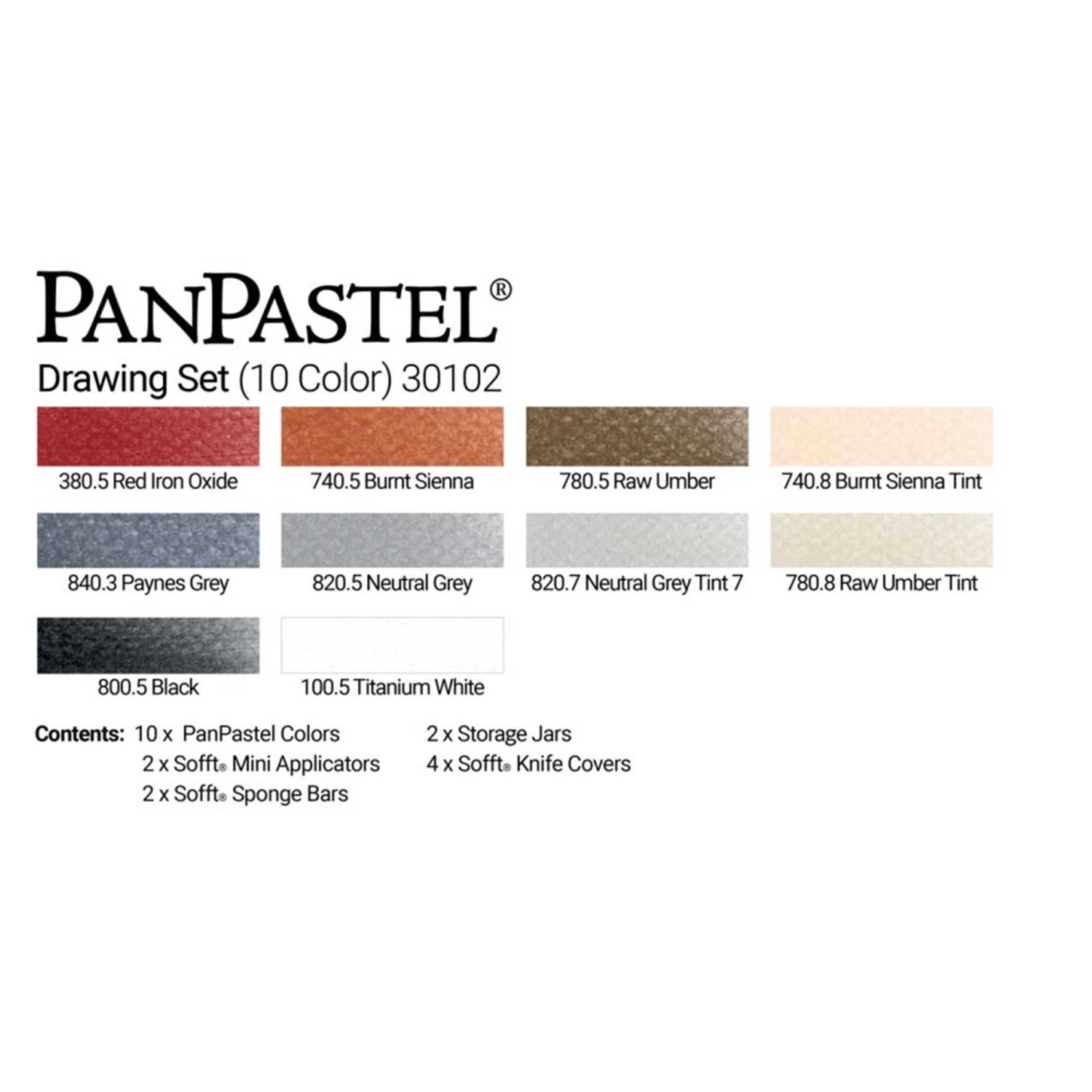 This product contains 10 Drawing PanPastel Colours, two Sofft Mini Applicators, two Sofft Sponge Bars, four Sofft Knife Covers (No. 1 and No. 2) and two Storage Jars.
