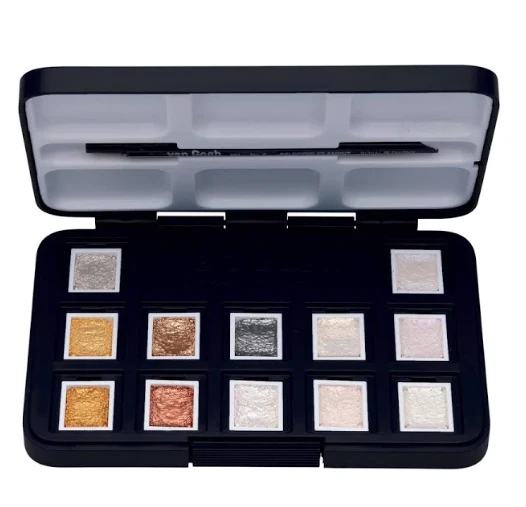 Van Gogh Watercolour Paints have a brilliant, intense and highly transparent quality and all the colours have the highest degree of lightfastness. The 12 half pan metallic & interference watercolour paints will be a great addition for all artists to use the set contains: silver, light gold, deep gold, bronze, copper, graphite, interference white, interference yellow, interference red, interference blue, interference violet and interference green.