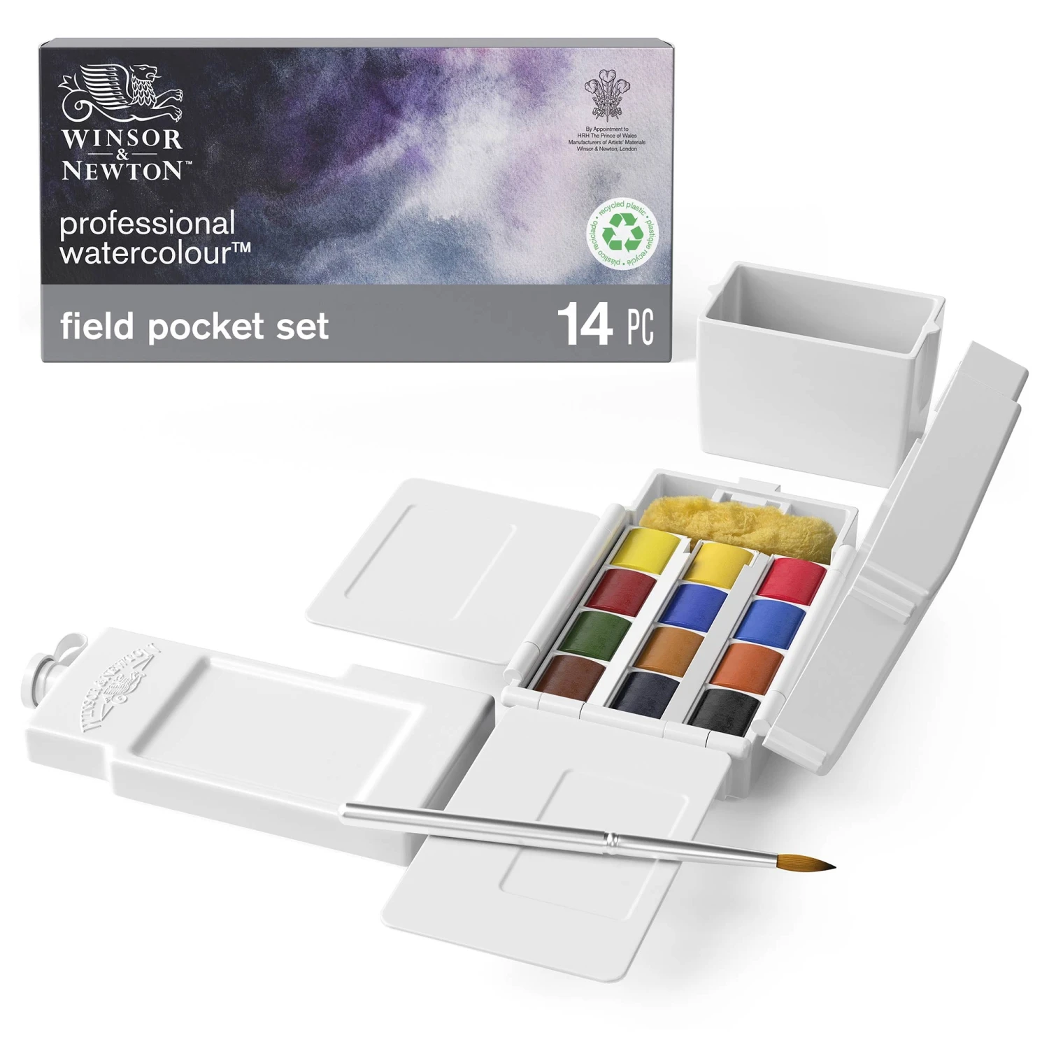 Featuring a host of artist quality Professional Watercolour half pans, a telescopic pocket brush and other handy tools to make painting in the field as convenient and intuitive as possible.